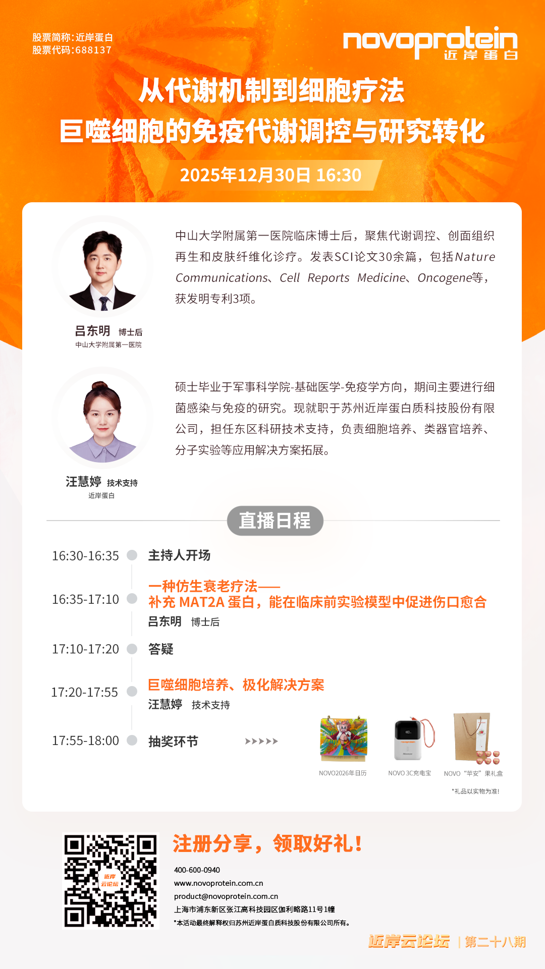 12月30日16:30,近岸蛋白特邀中山大学附属第一医院临床博士后吕东明和近岸蛋白汪慧婷两位老师开启近岸云论坛线上直播,聚焦“巨噬细胞的免疫代谢调控与研究转化”主题。吕东明老师将介绍创伤愈合过程中巨噬细胞与血管周细胞的相互作用,揭示了代谢异常如何通过诱导细胞衰老,进而破坏正常修复进程的全新机制。这项研究不仅为理解慢性创面的病理机制提供了新视角,更为开发创新疗法奠定了理论基础。汪慧婷老师也从技术应用角度,深入解析巨噬细胞培养、极化解决方案,帮助科研人员更高效、更精准地开展巨噬细胞相关研究,从基础机制探索到转化医学应用。